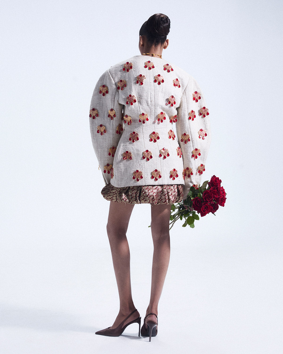 An ivory structured jacket with a V-neckline and elegantly sculpted with voluminous shoulders that create a striking arch. Crafted with meticulous detail, it is enriched with custom-designed jewels featuring intricate patterns and ruby stones artfully set throughout, adding a luxurious and timeless touch.