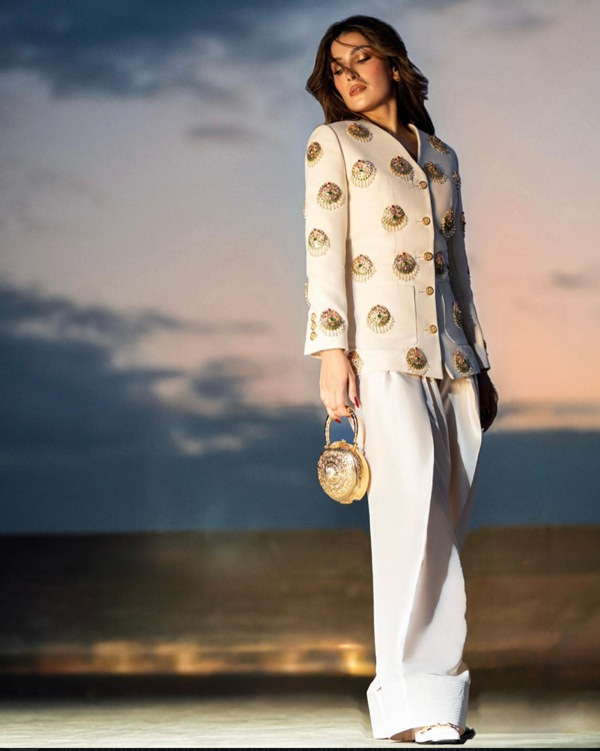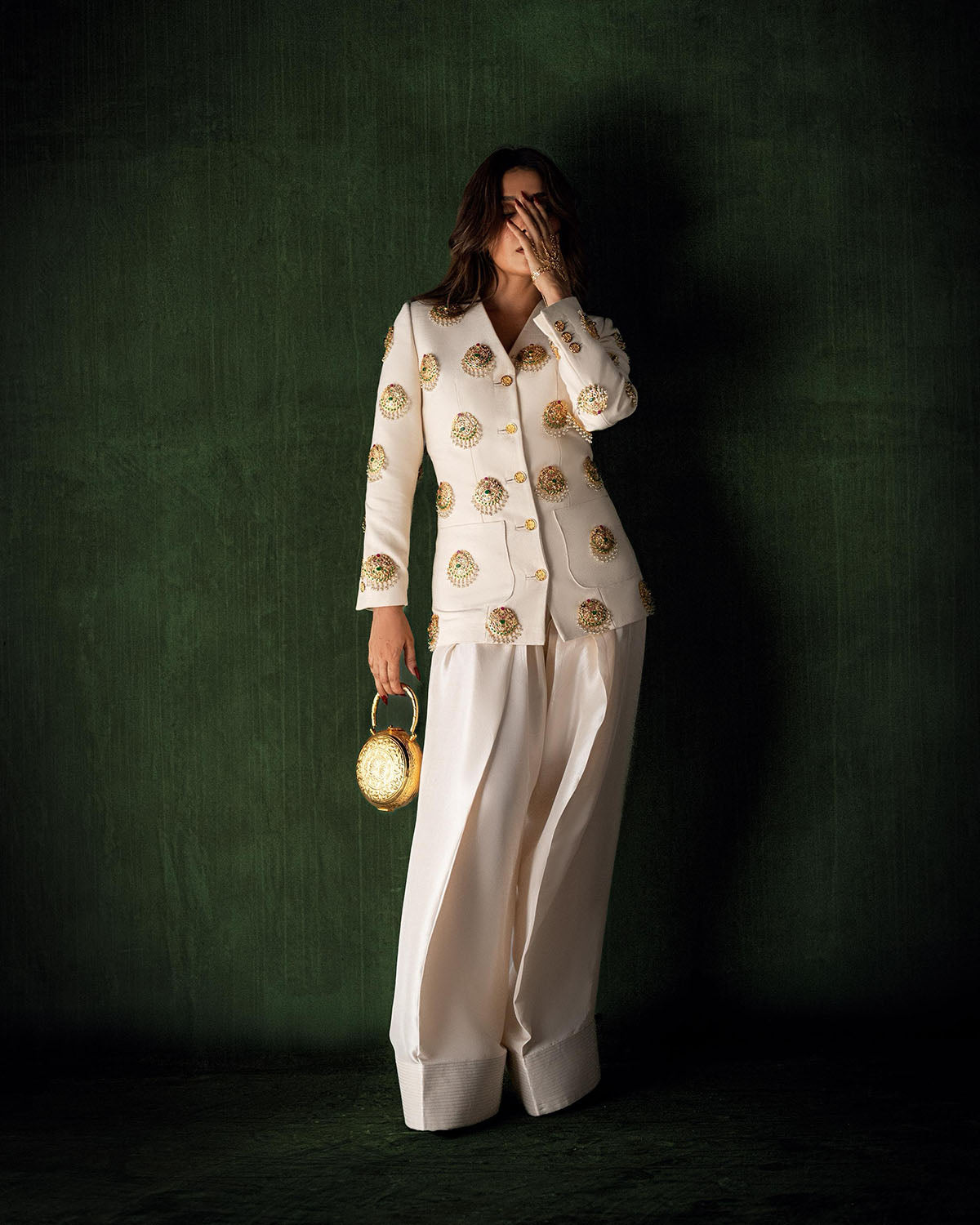 This sophisticated ensemble features a tailored jacket crafted from exquisite hand-woven fabric, showcasing impeccable craftsmanship and attention to detail. The jacket is elevated with a custom-made hand jewel, thoughtfully placed on the base to add a touch of refined elegance. Paired with a raw silk shalwar, known for its luxurious texture and timeless appeal, this outfit effortlessly combines modern tailoring with traditional charm, making it an exceptional choice for distinguished occasions.