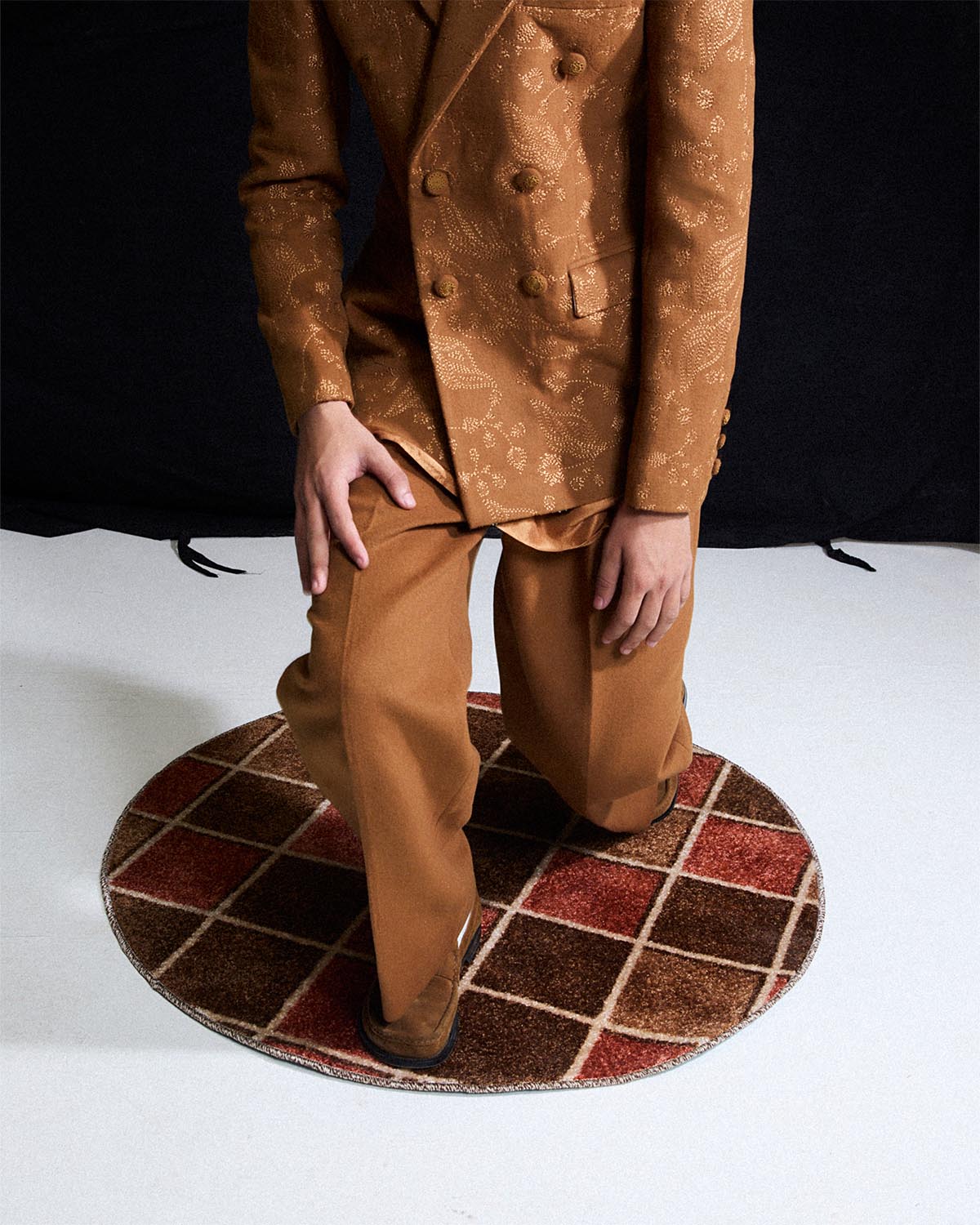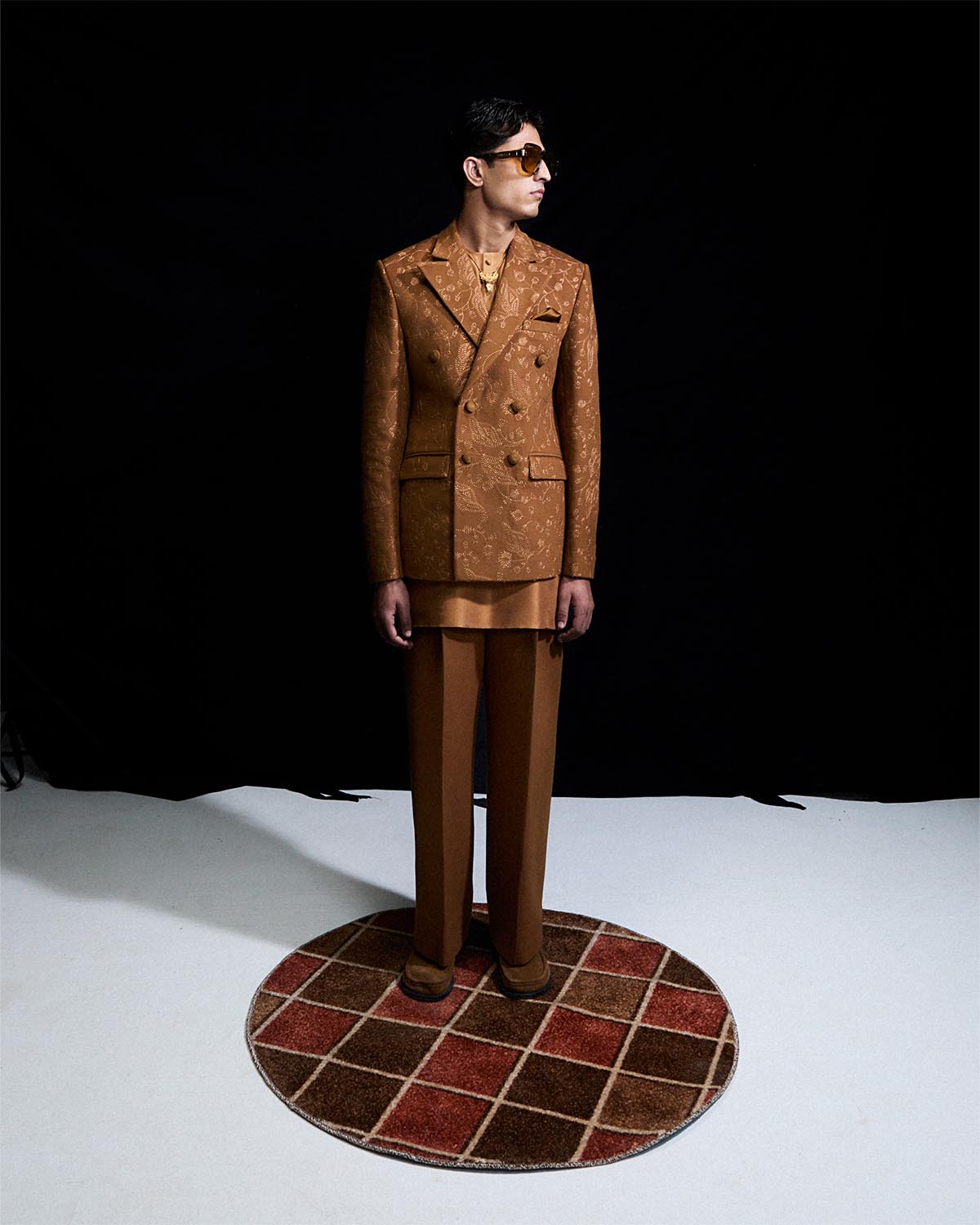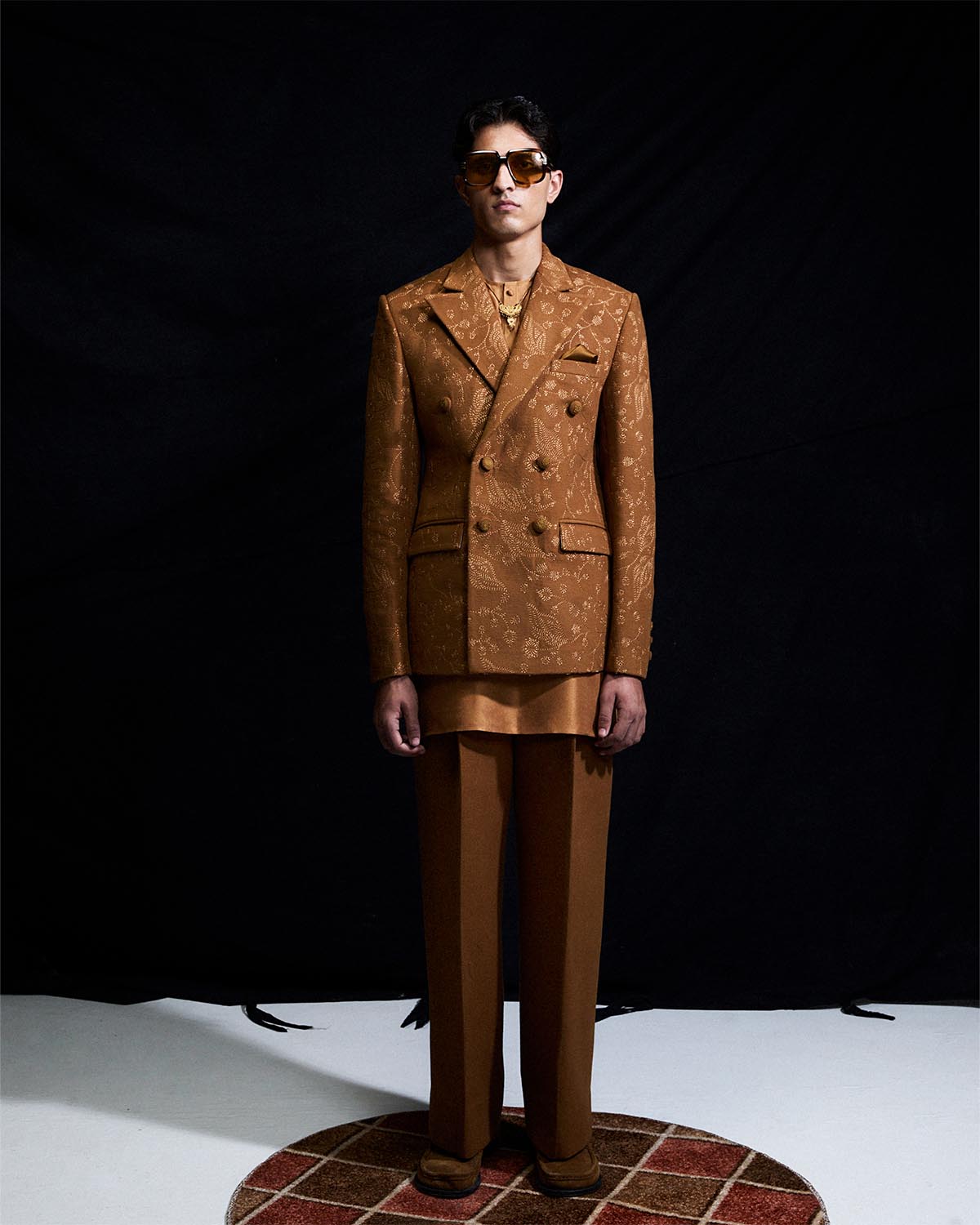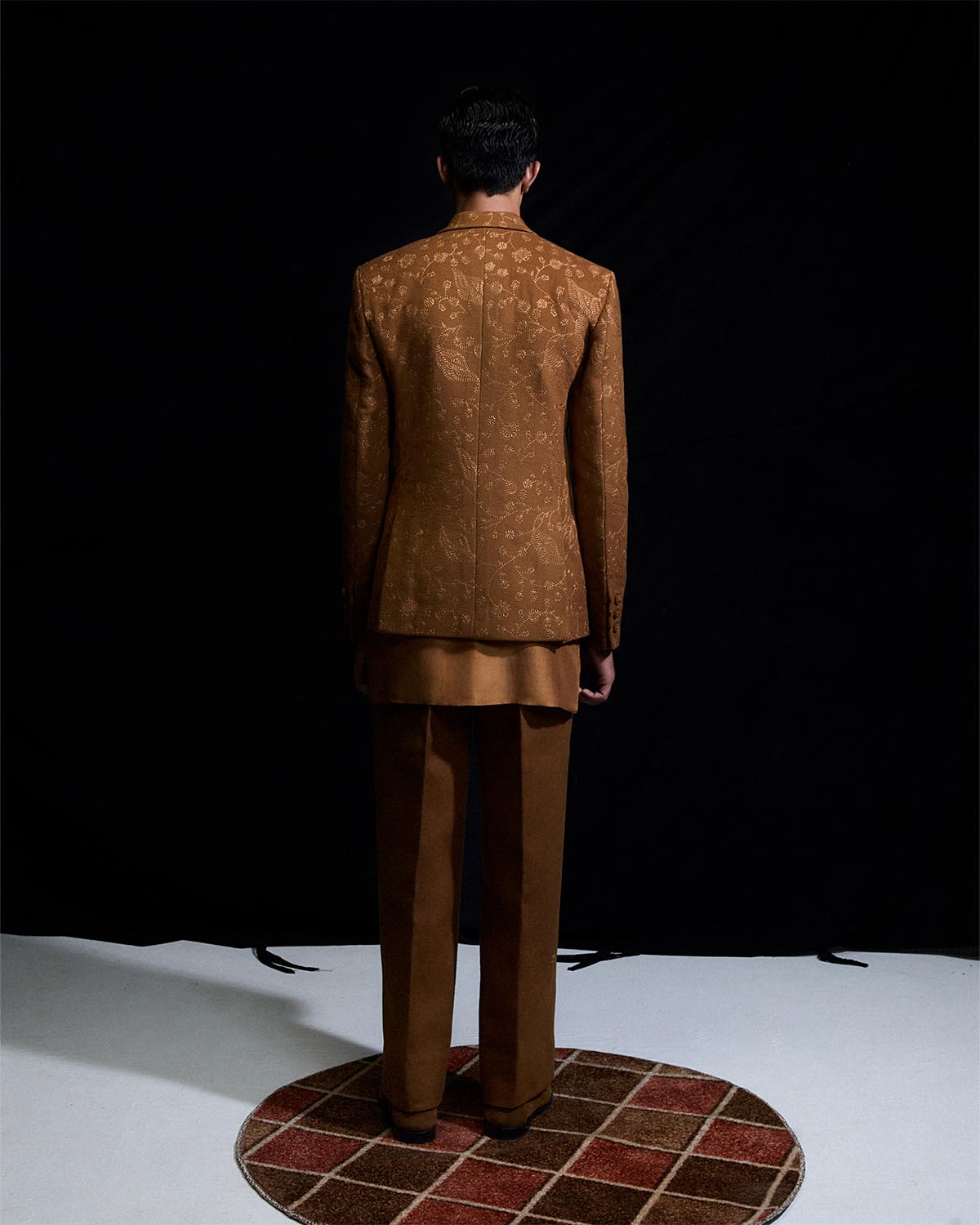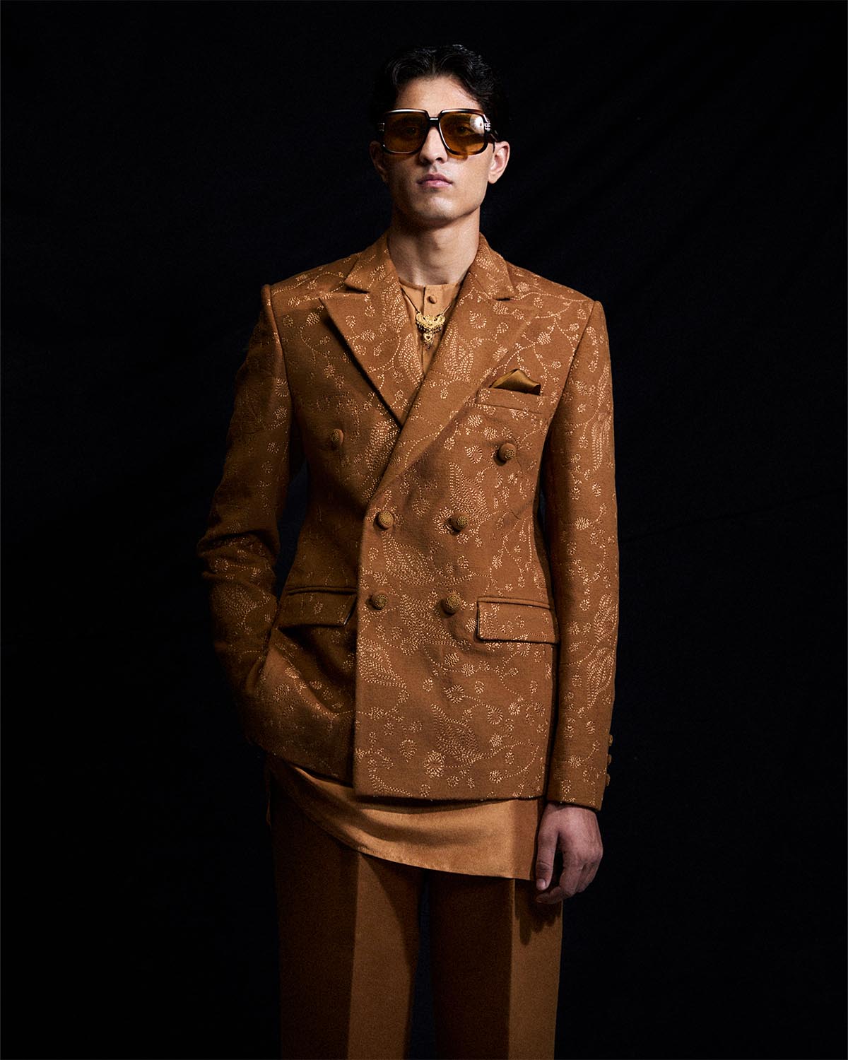 The honey brown three piece set comprises a double breasted wool coat , embellished with all over embroidery and finished with hand embroided buttons. It is layered over a pure silk kurta and paired with straight woolen trousers.