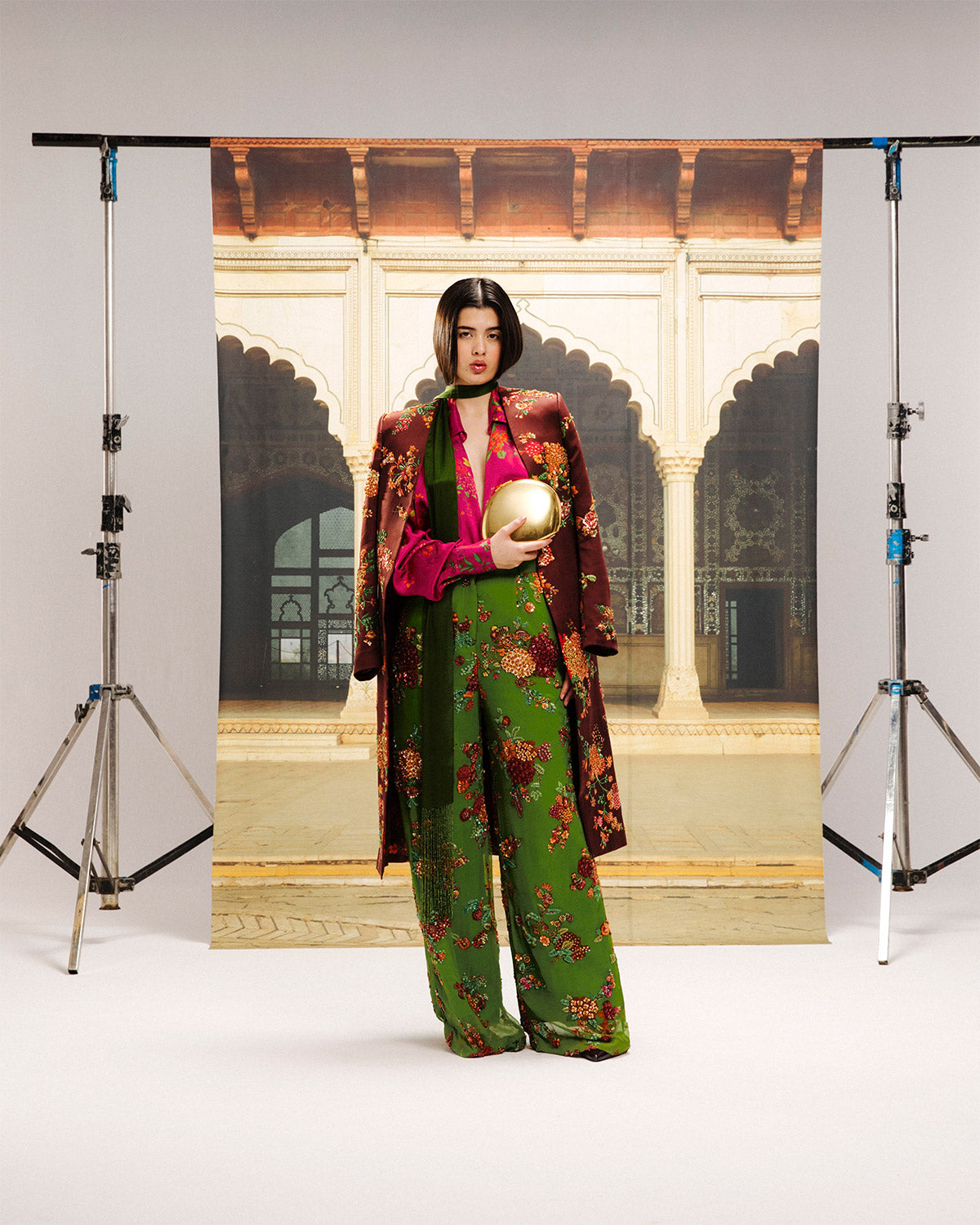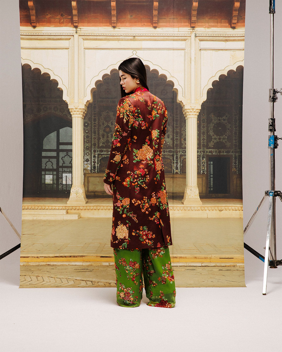 A bold celebration of color and craftsmanship, this ensemble features a tailored burgundy brown satin silk jacket, fully embellished with intricate sequins and beadwork, reflecting the grandeur of Lahore’s architectural detailing. The vibrant green chiffon pants echo the same embellishments, while the hot pink silk dress shirt adds a striking contrast. Perfect for making a statement, this design marries tradition with contemporary sophistication.
