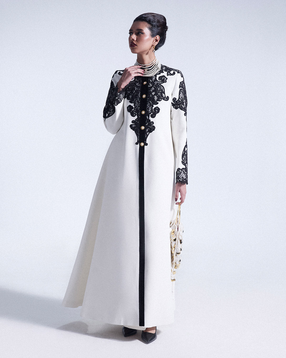 Crafted in ivory grip, this long structured jacket features a refined crew neckline, elevated with handcrafted black Chantilly work along the neckline and sleeves. Customized pearl buttons add a touch of understated elegance. Add on ( Bag is a separate accessory)