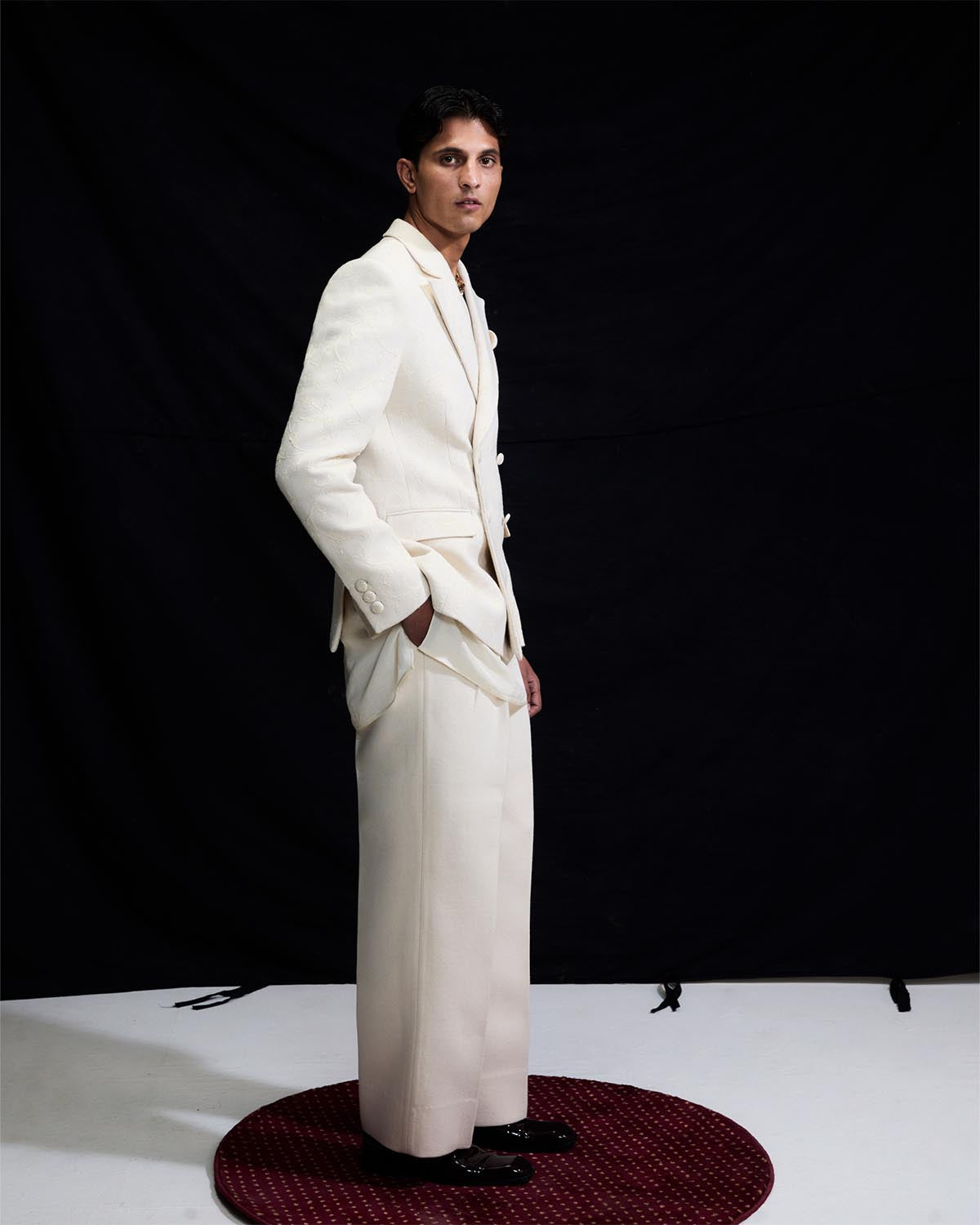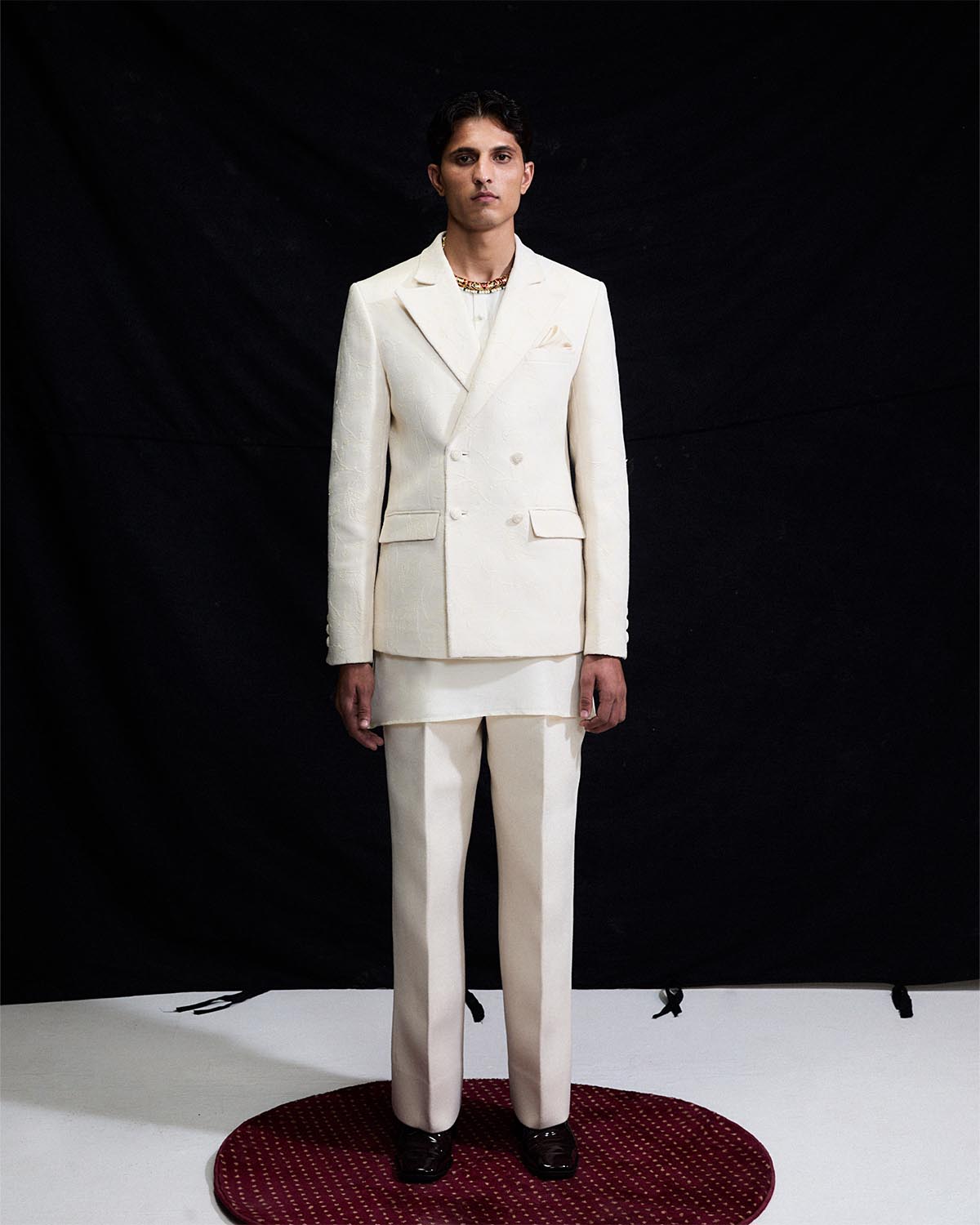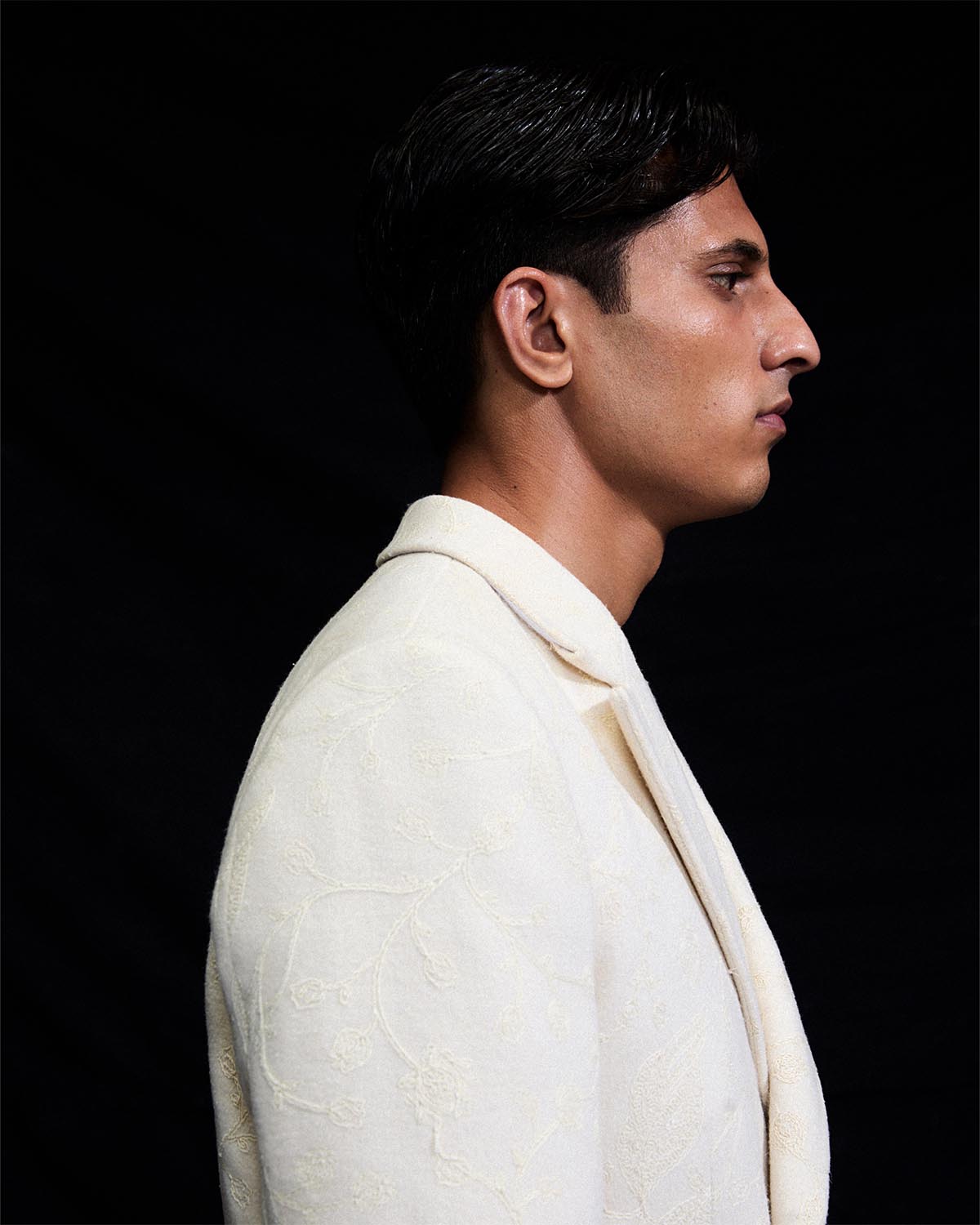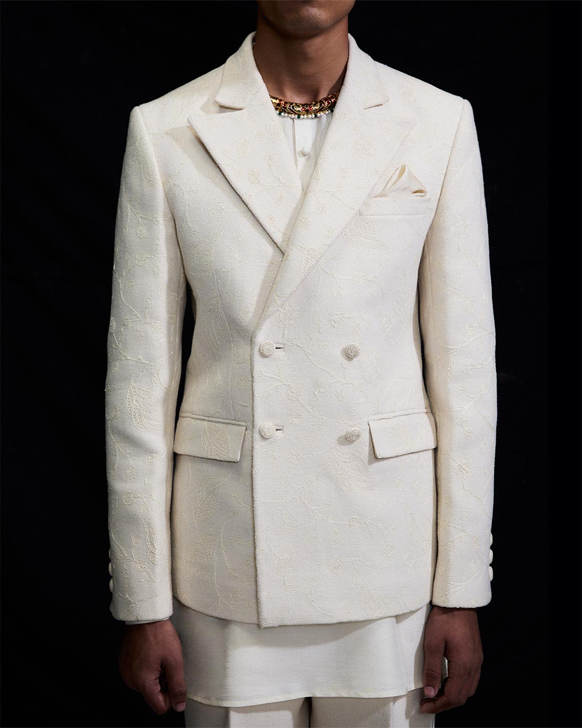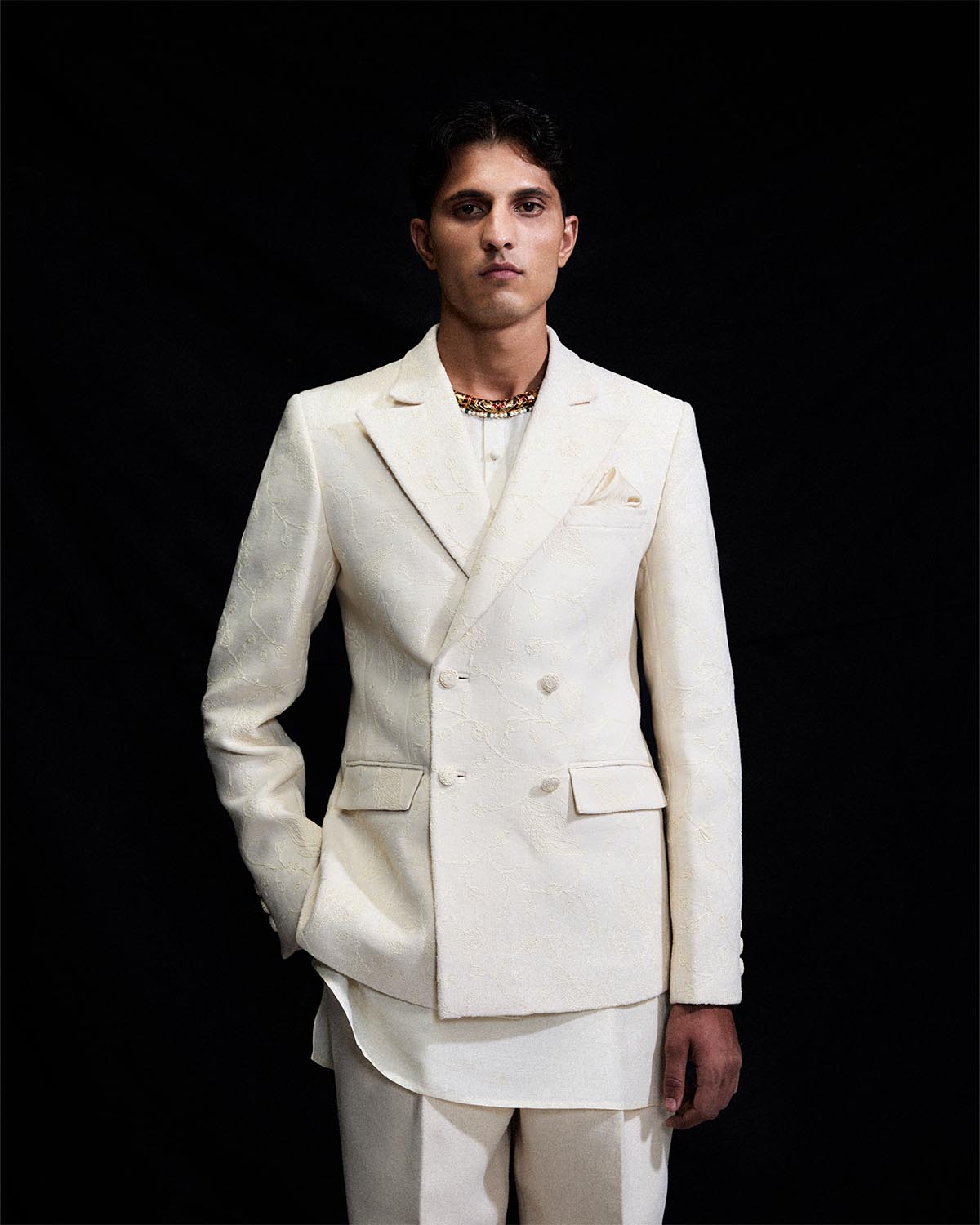 The coral white three piece wool set features a notch collar woolen blazer, embellished with all over white dori embroidery. It is layered over a pure silk short kurta and completed with straight cut white woolen trousers.