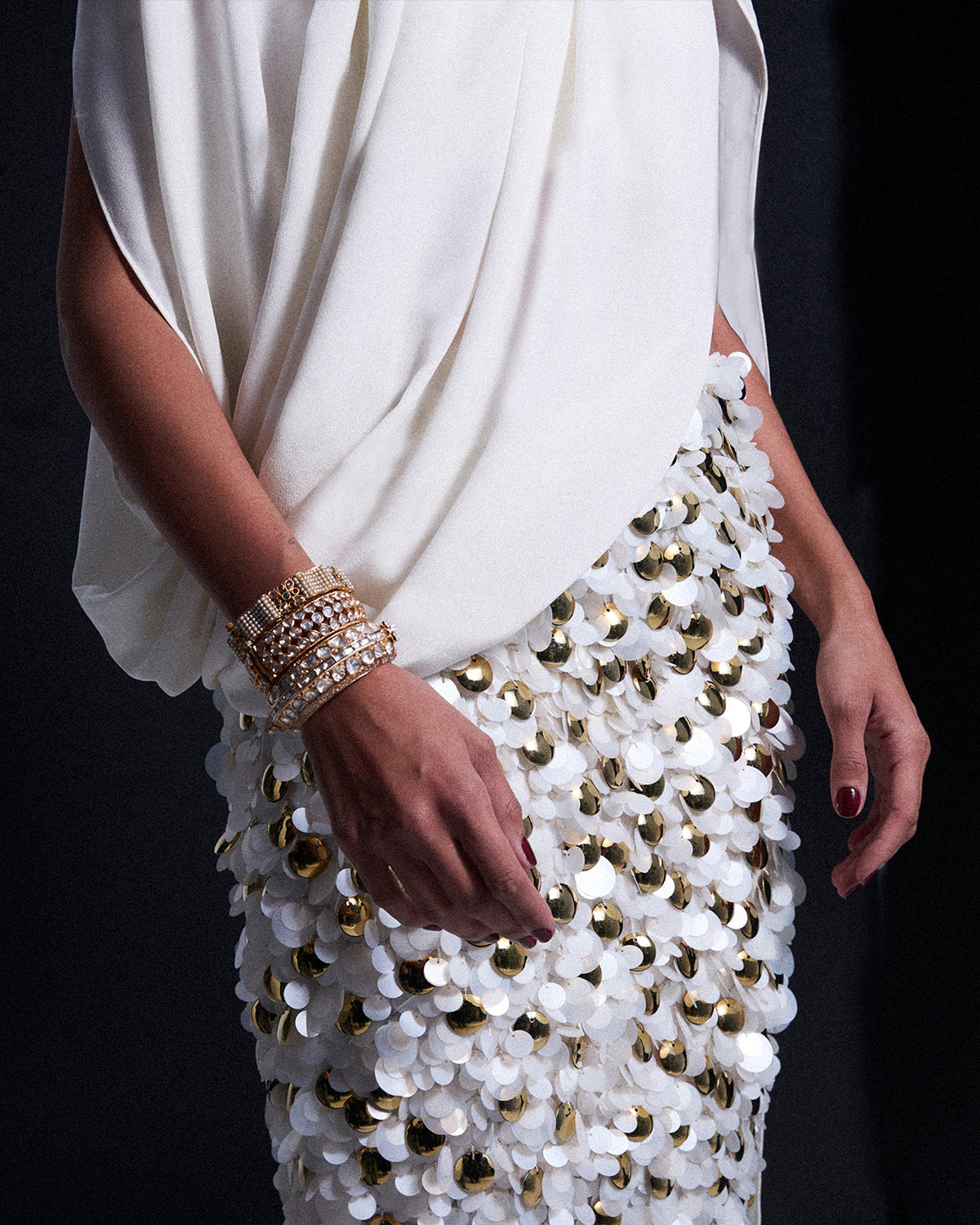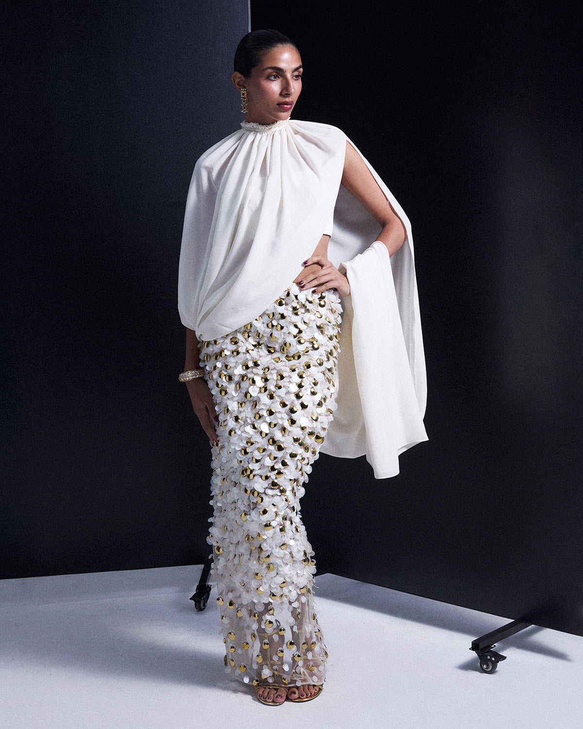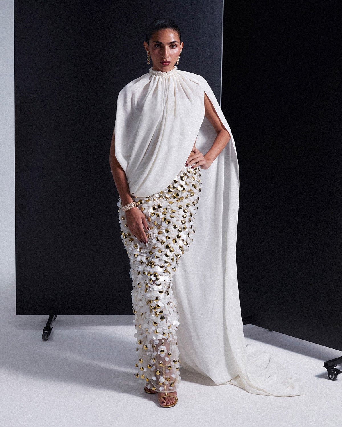 This dinstinctive ivroy outfit features a sculptural draped ivory top flows effortlessly over the silhouette featuring soft gathers at the neckline and a fluid cape-like fall that adds movement and drama. The look is anchored by a striking pencil skirt embellished with sequins and gold metal coinsce. Paired with tailored grip trousers, the ensemble exudes timeless sophistication.