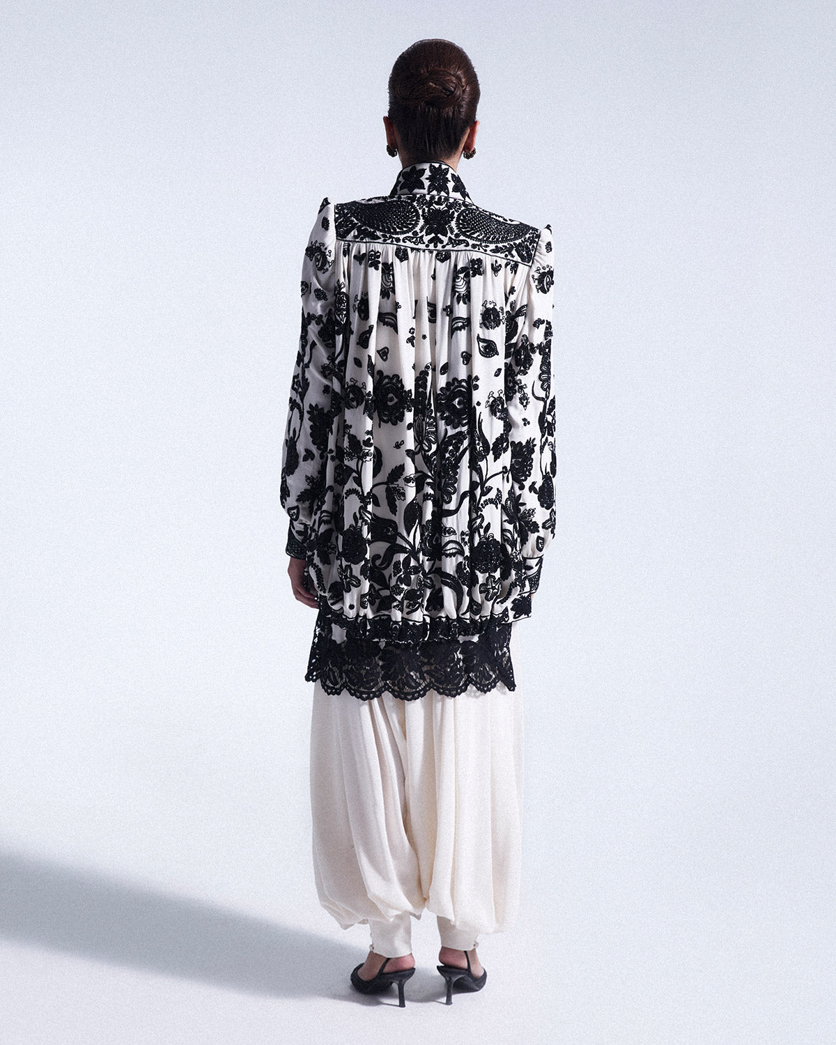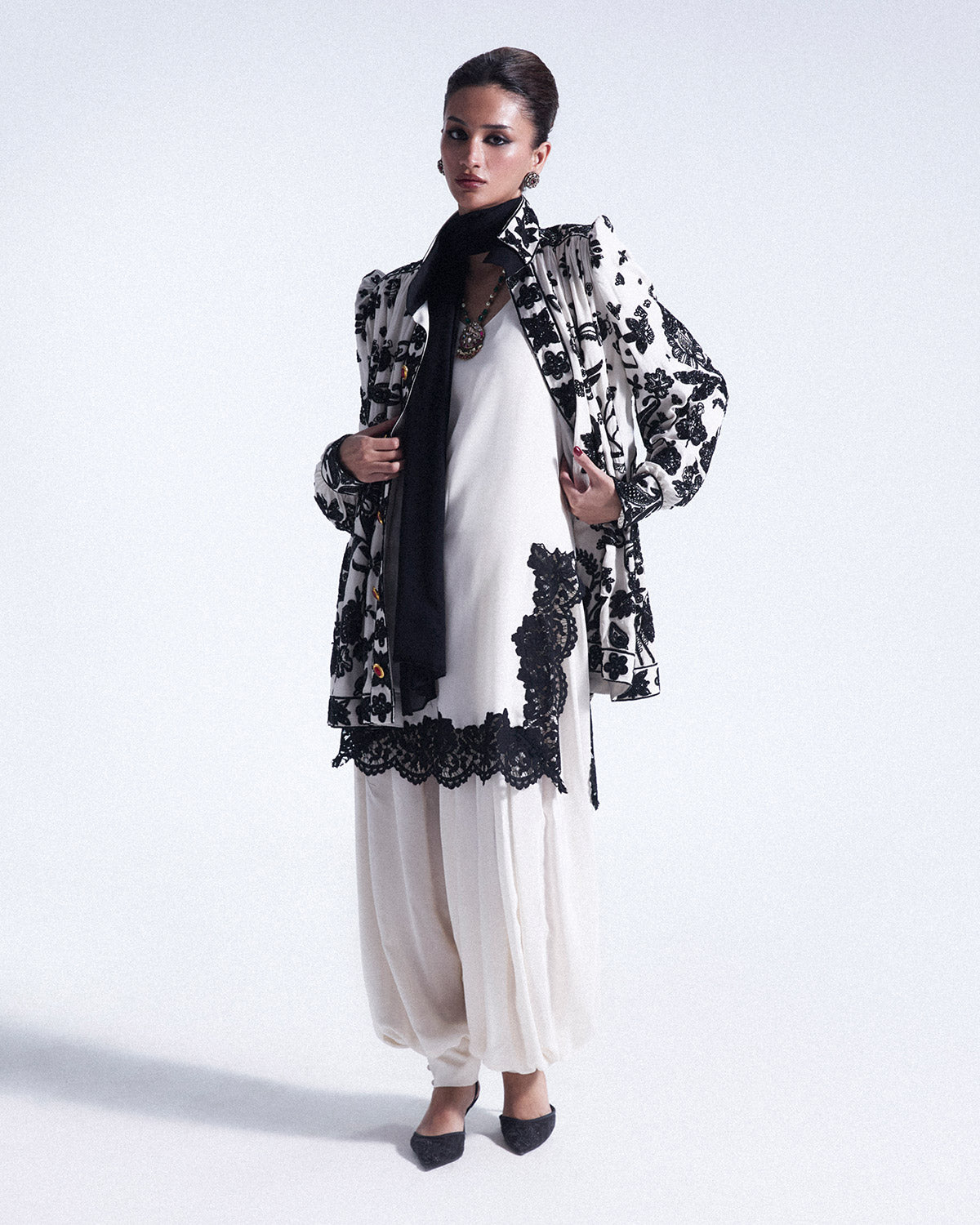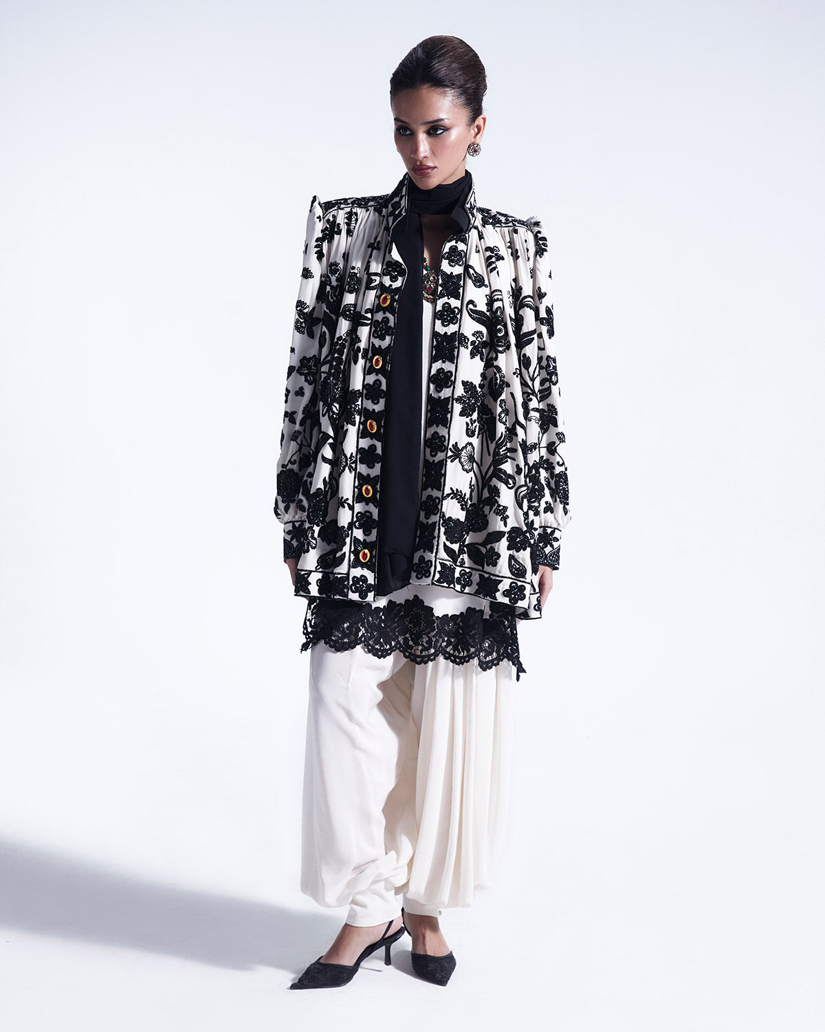 The signature ivory three-piece ensemble features a sculpted grip jacket with a sharp double collar and dramatic bishop sleeves. Soft gathers at the front shoulders and back waist create effortless volume, while customized ruby-toned metallic buttons add a refined accent. Intricate black cutdana, bead, and dori work—arranged in floral and geometric motifs offers striking contrast. The look is paired with a sleeveless d grip shirt finished with an elegant Chantelle border handcrafted and completed with fluid harem pants for a modern, graceful silhouette.