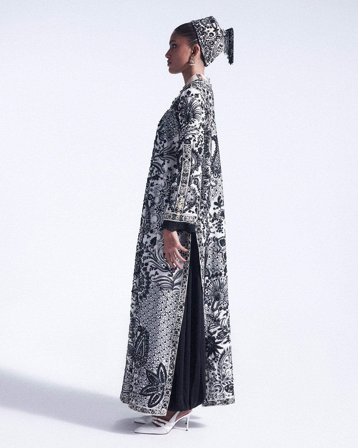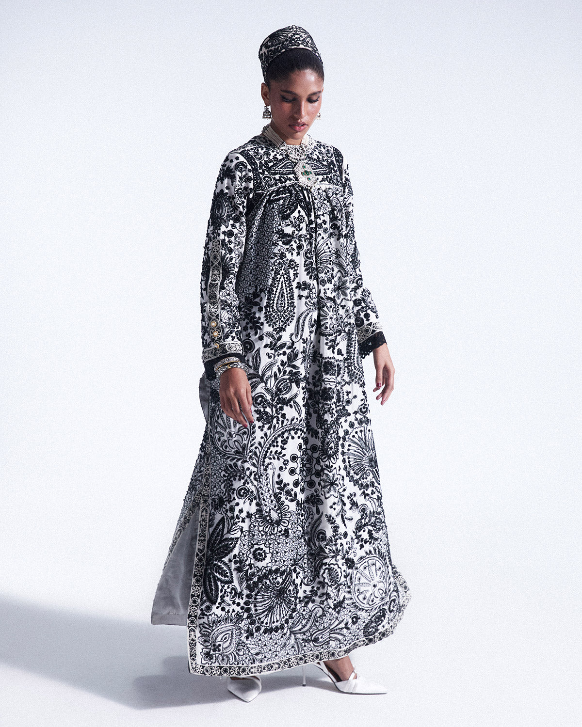 Woven in pure grip is a signature ivroy crew neck long shirt with minimal side slits. Suzani inspired black embroidery produced industrially enhanced with subtle black embellishment adds refined texture and sophistication, creating a strikingly elegant and contemporary statement piece. Paired off with sleek harem pants.