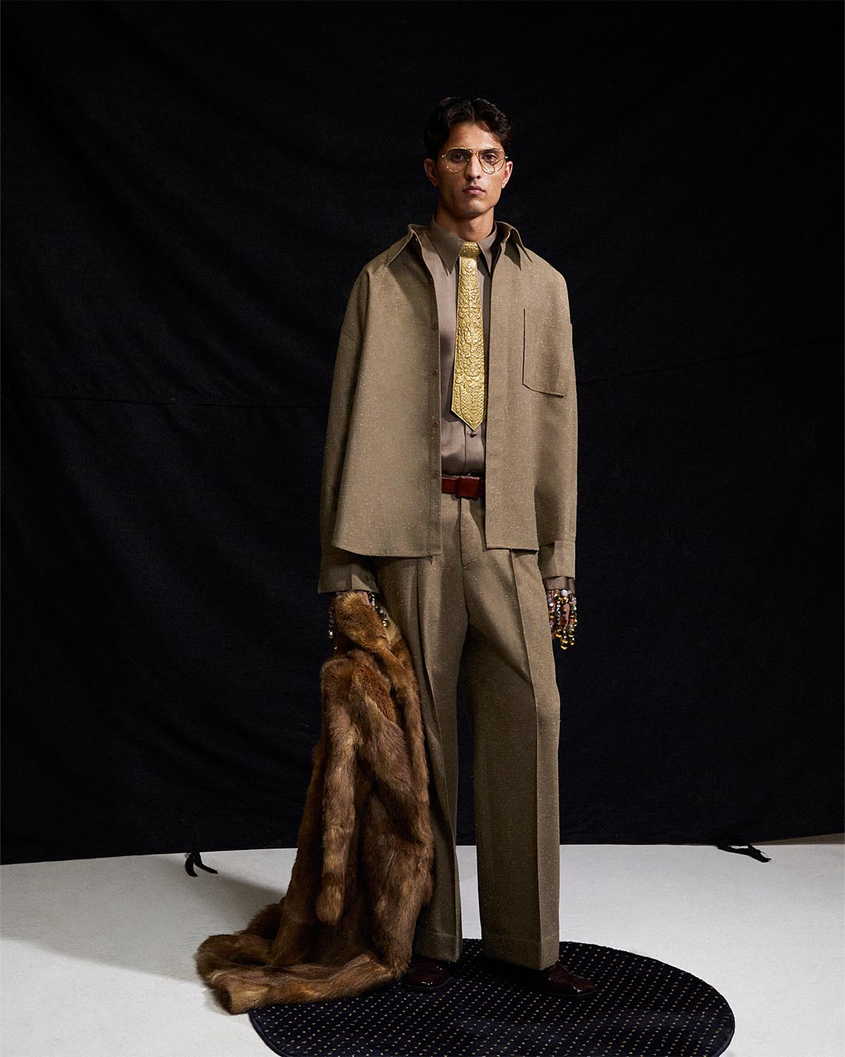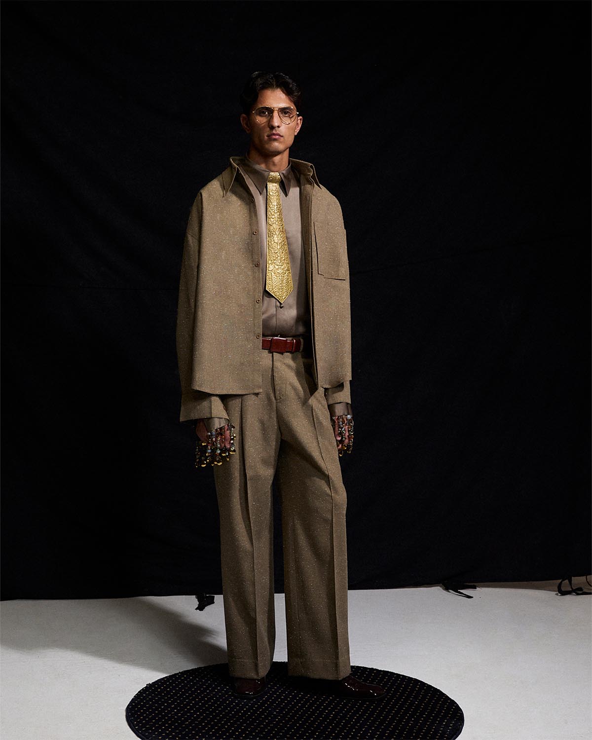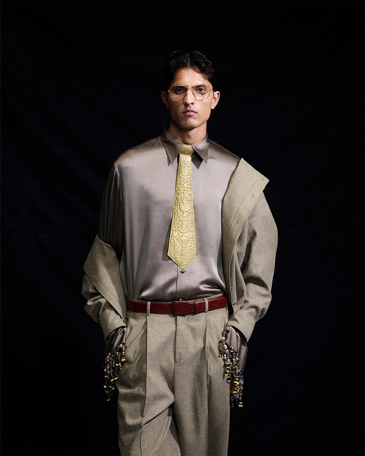 The look features a loose fit, boxy jacket tailored in khaddar. It is paired with a button down shirt and crafted in our signature pure silk, finished with tassel detailing at the cuffs. The ensemble is completed with straight cut khaddar pants.