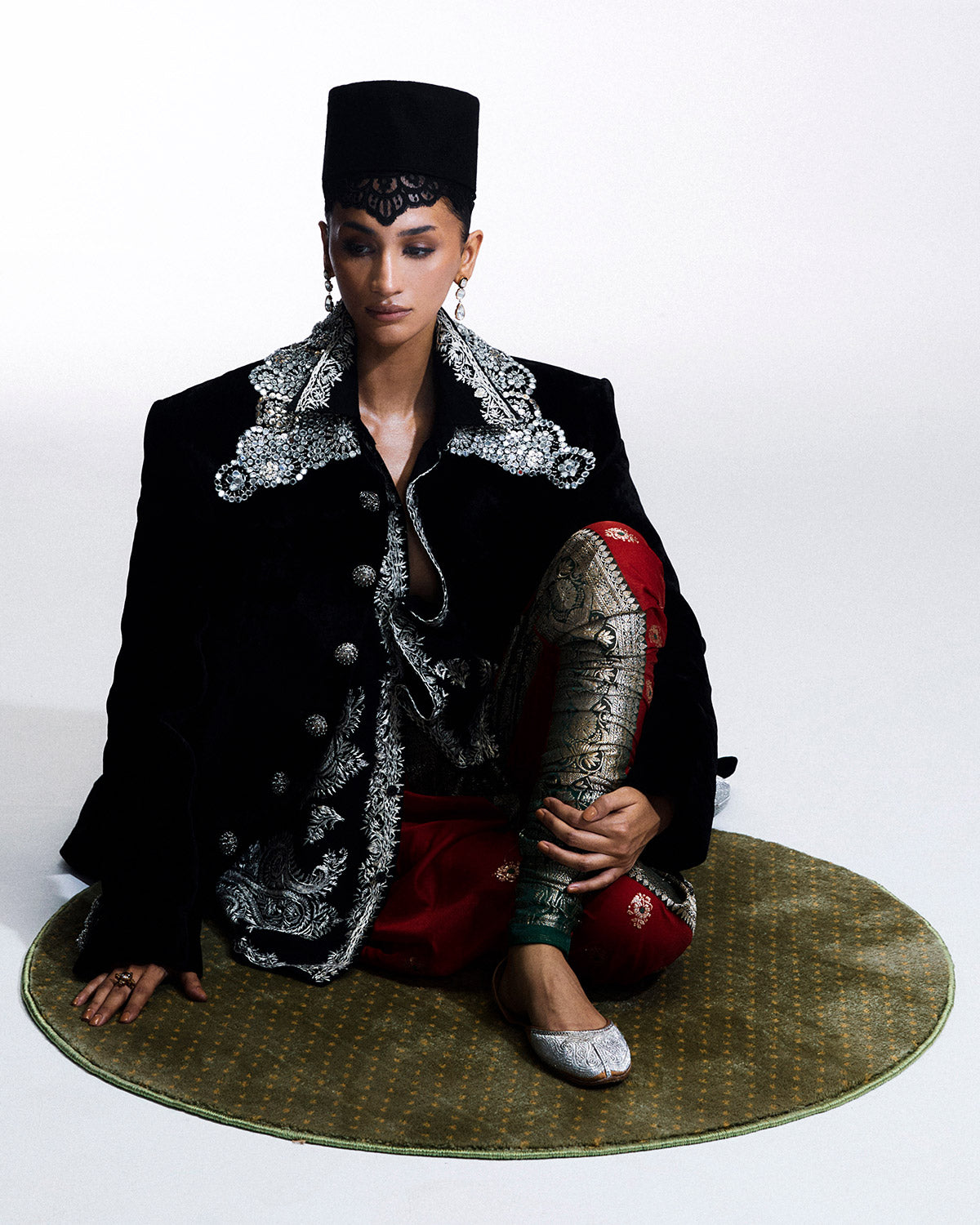 A luxurious long velvet coat featuring intricate silver buttons that add a touch of sophistication. The look is elevated with a handcrafted collar embellished in mirror, metal and beadwork blending artisanal detail with elegant design for a striking, refined finish.