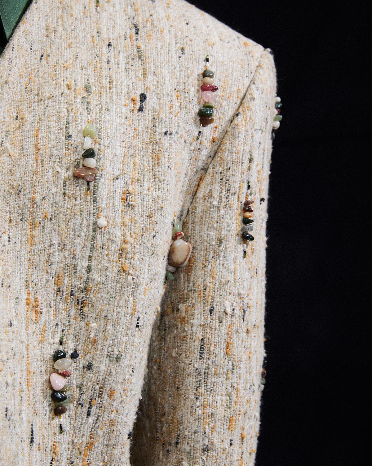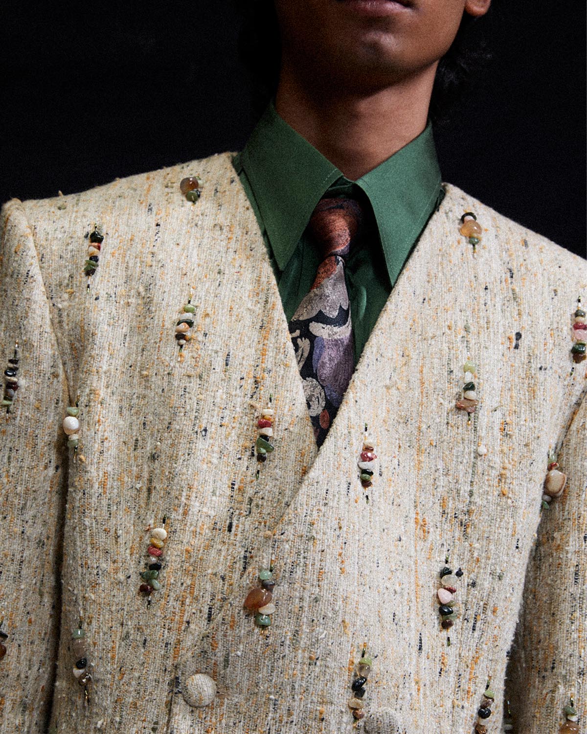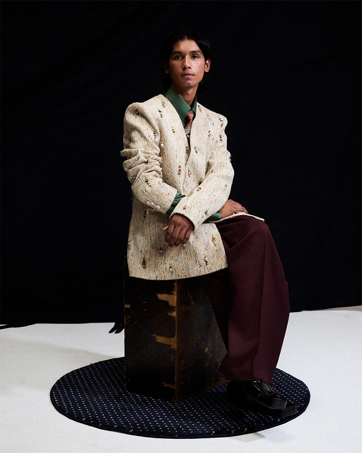 The three piece ensemble comprises a double breasted beige khaddar blazer with a v neckline, detailed with semi precious stones integrated into the yarn. It is styled with a leaf grean button down shirt in pure satin silk and completed with maroon trousers.