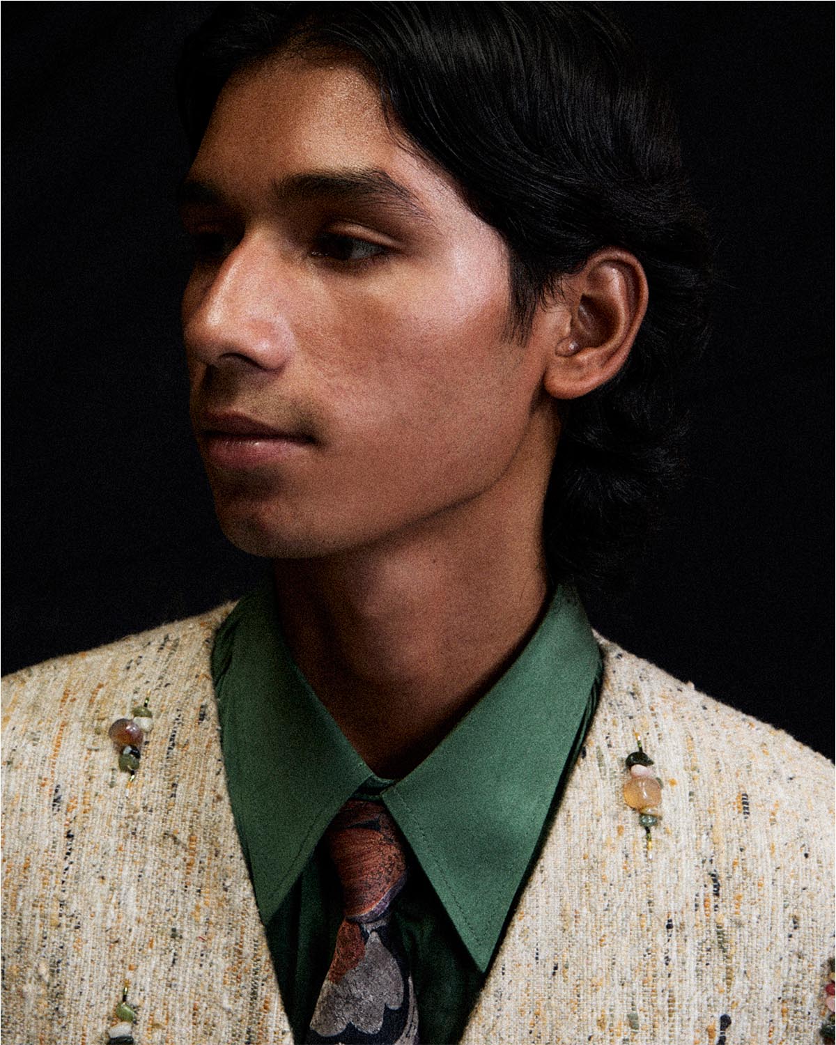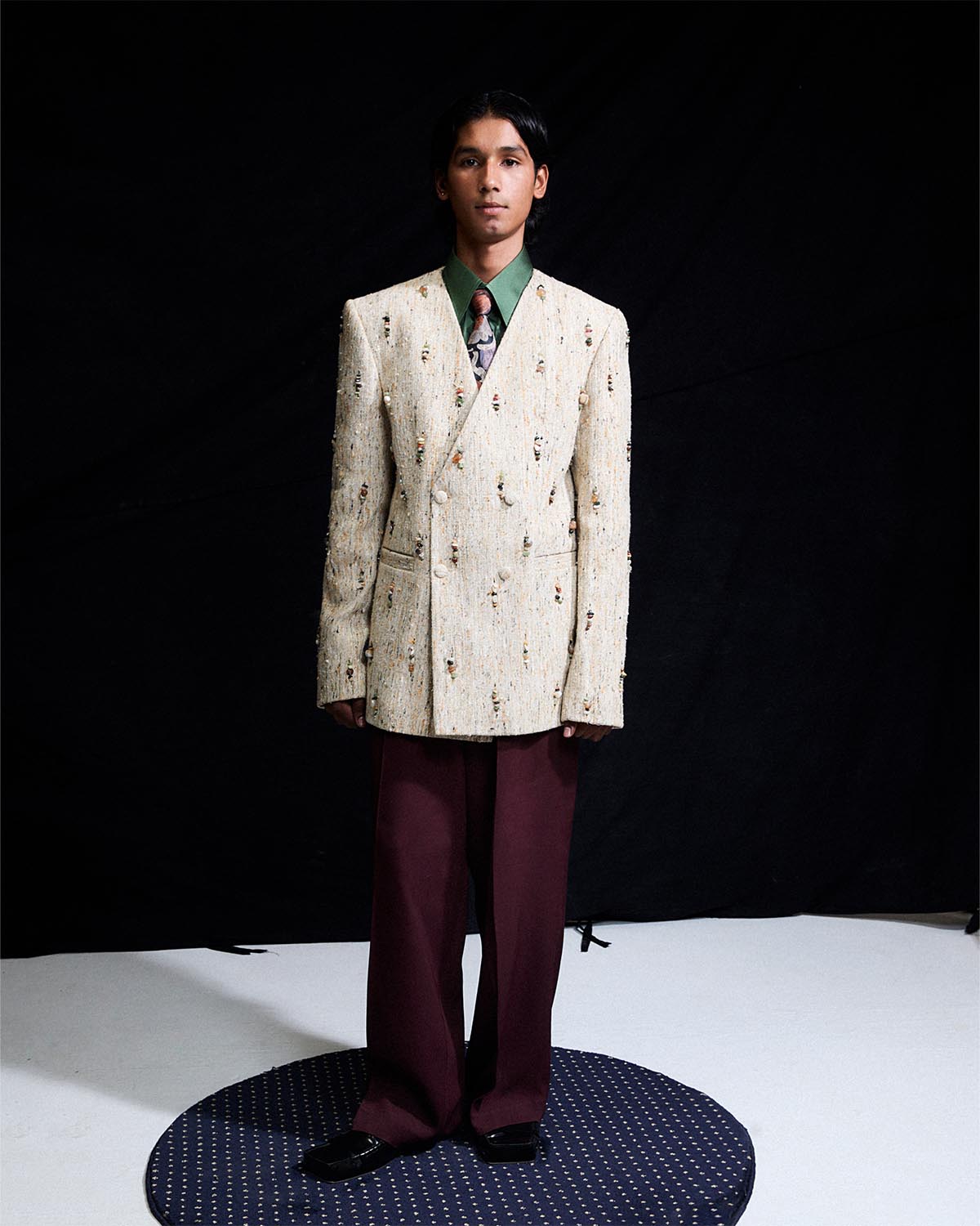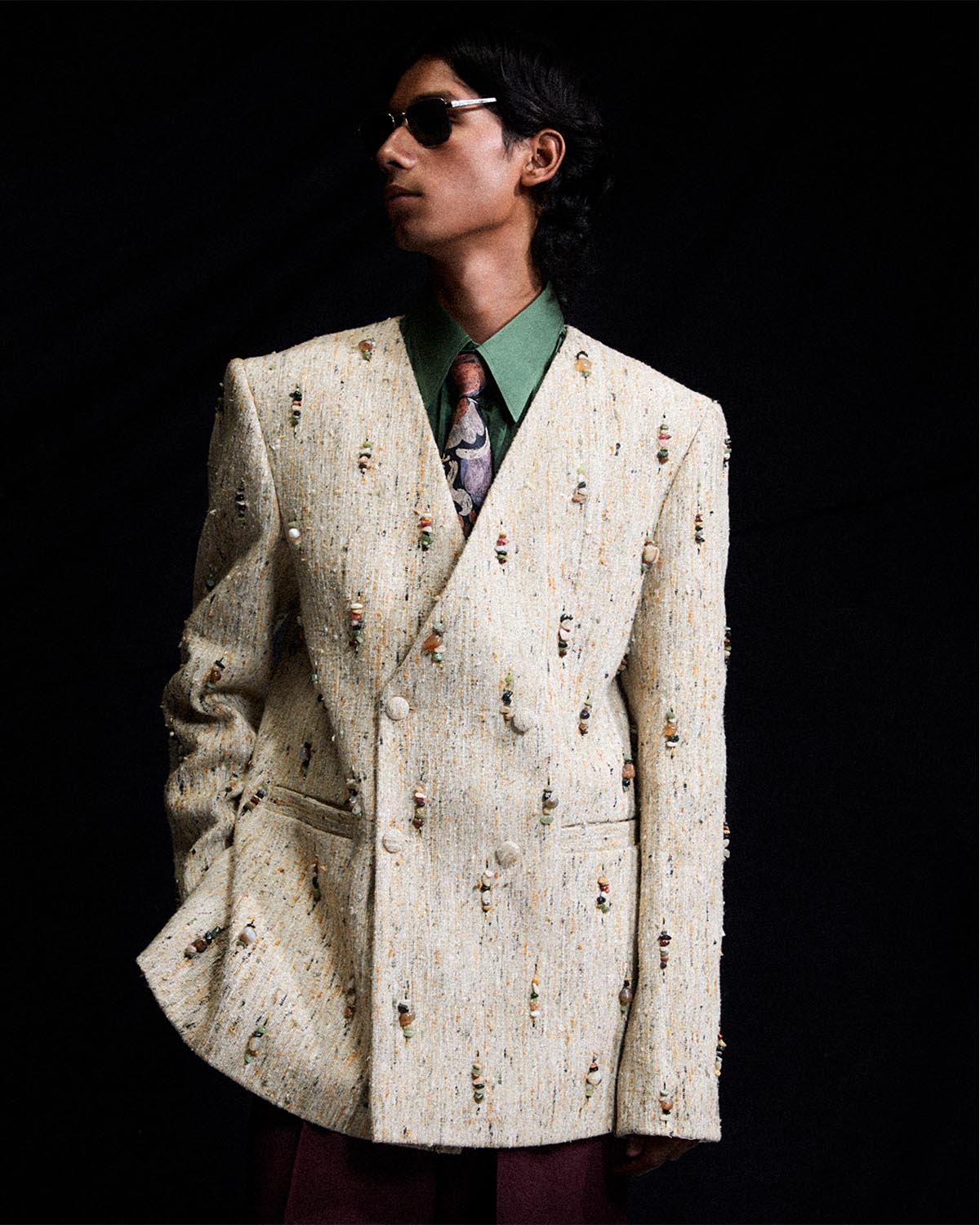 The three piece ensemble comprises a double breasted beige khaddar blazer with a v neckline, detailed with semi precious stones integrated into the yarn. It is styled with a leaf grean button down shirt in pure satin silk and completed with maroon trousers.