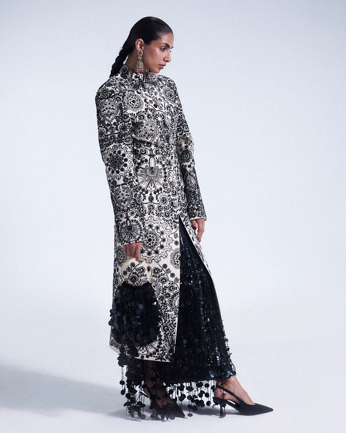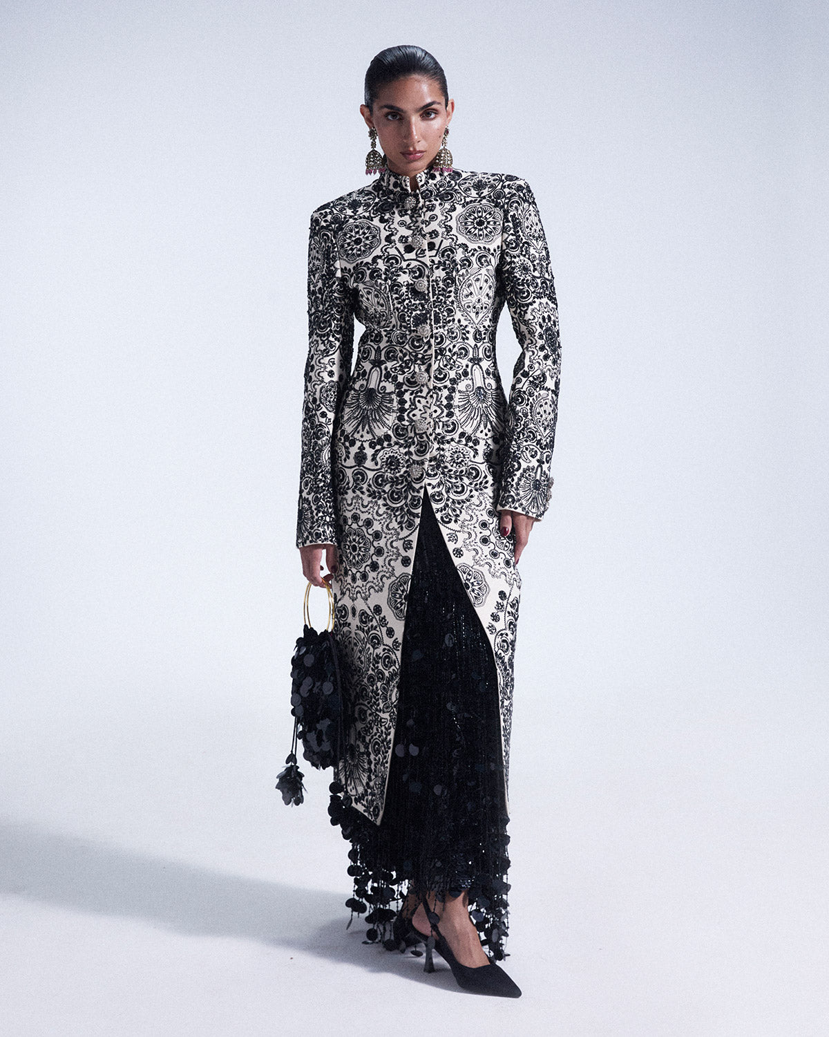 A long ivory khaddar coat in a sherwani style, featuring a banner collar. Suzani inspired black embroidery produced industrially enhanced with subtle black embellishment adds refined texture and sophistication, creating a strikingly elegant and contemporary statement piece. Paired off with a sleek shimmy black dress adorned with black embellisments flowing in tassles at the hem. Add on ( Bag is a separate accessory)
